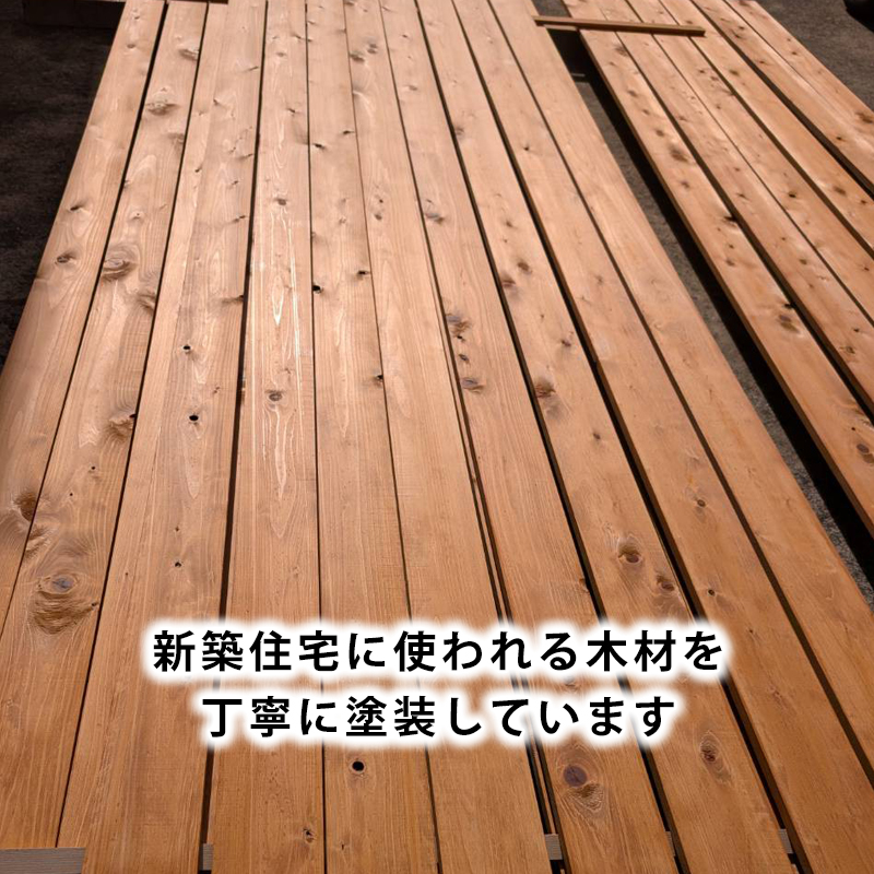 新築住宅に使われるウッドデッキの材料を丁寧に塗装しています