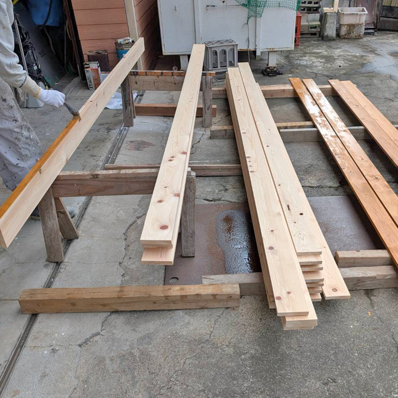 沼津市の新築住宅に使われる木塀とウッドデッキの材料を、当社作業場で丁寧に塗装しています。
