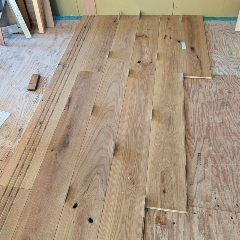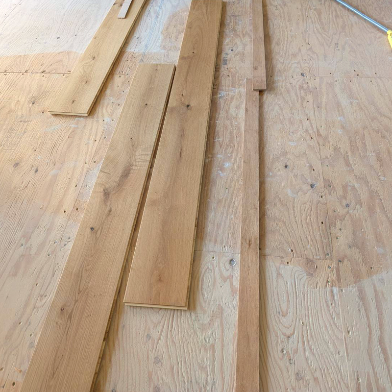 床張り工事が順調に進んでおり、床材に直接溝を掘って、間仕切り戸のレールを埋め込んでいます。
